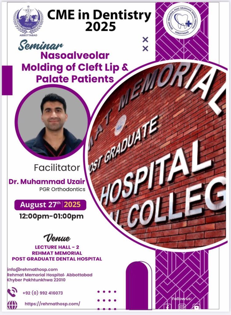 CME in Dentistry 2025 Rehmat Memorial Post Graduate Dental Hospital, Abbottabad, organized a seminar on “Nasoalveolar Molding of Cleft Lip & Palate Patients” on August 27, 2025.The session was facilitated by Dr. Muhammad Uzair (PGR Orthodontics), who shared valuable insights into the role of nasoalveolar molding in the early management […]